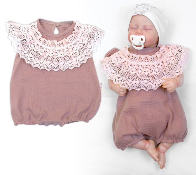 Body s nohavičkami, mušelín s krajkou BOHO – hnědorůžová, vel. 86
