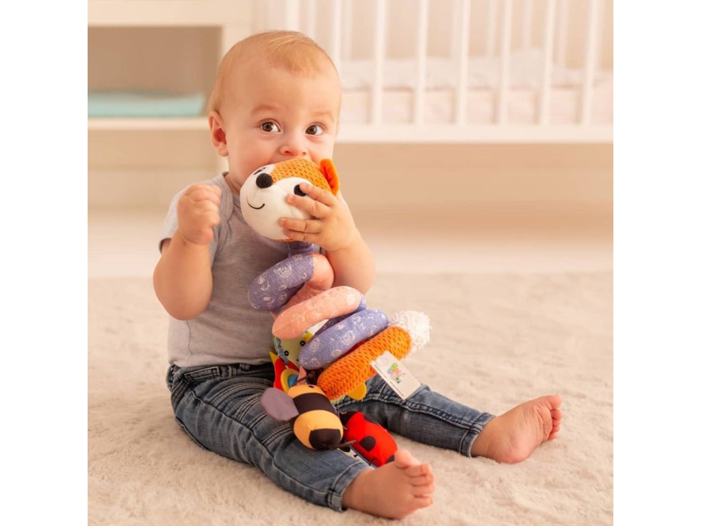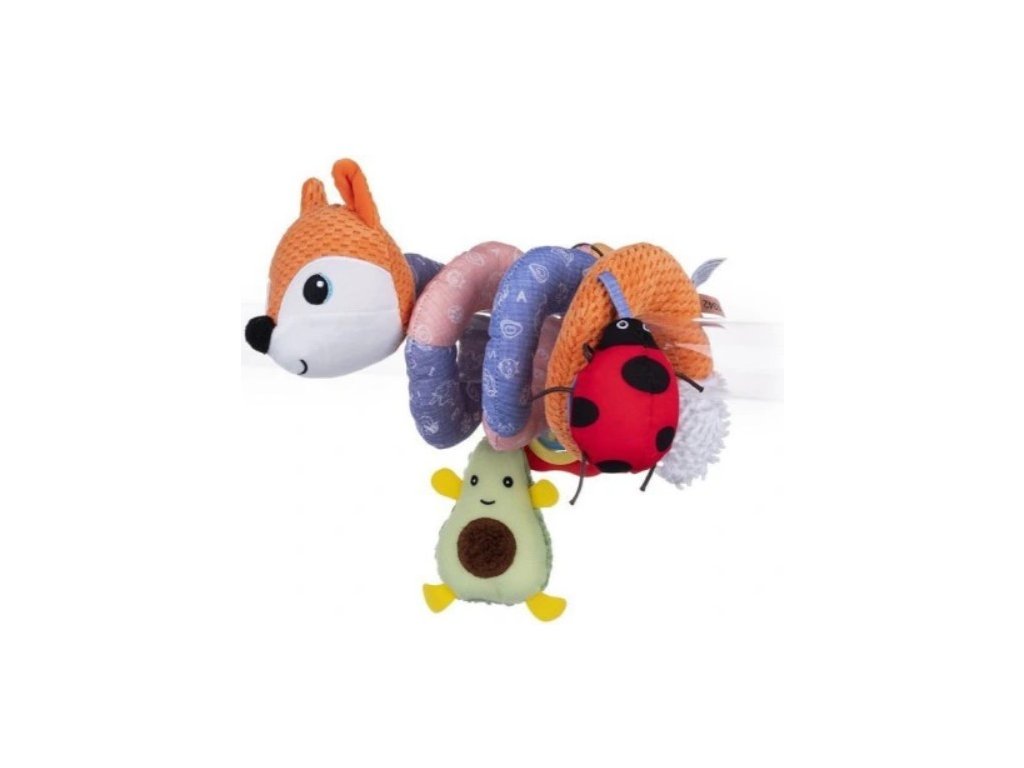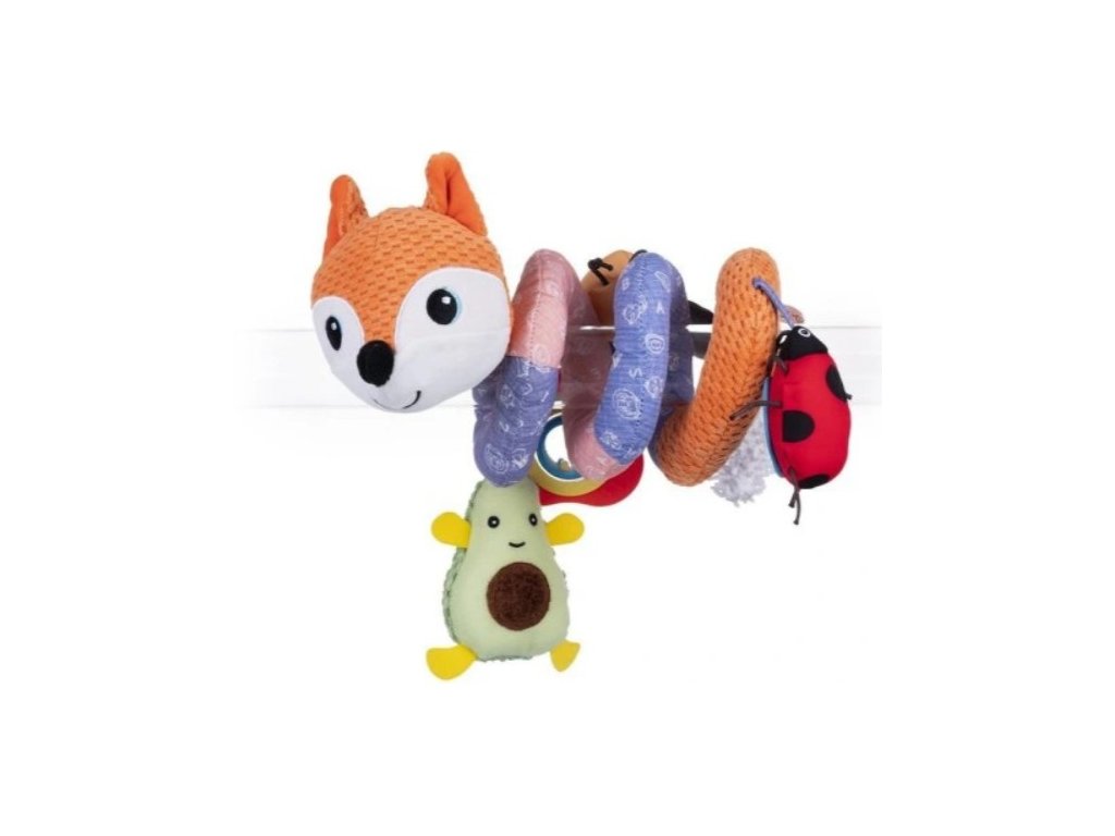Aktivní spirála Liška. Liška obecná s veselým týmem vás zvou na multifunkční zábavu! Tato krásná spirála je vyrobena z různých materiálů, které stimulují hmat dítěte. Roztomilé avokádo vtipně chrastí, přívěsek s korálky bude skvělým kousátkem, beruška s bezpečným zrcátkem se seznámí s dítětem a včelka rozveselí okouzlujícím pištěním. Výrobek je určen pro děti od narození.Doplňkové parametry