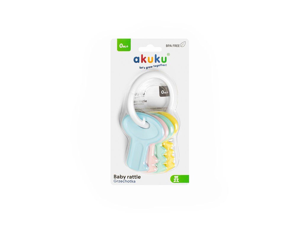 Chrastítko pro miminko Akuku. Chrastítko je ideální první hračkou pro miminko, protože je lehké a snadno uchopitelné. Dítě ji může snadno chytit a držet v ručičkách. Má jemně zaoblené tvary. Hračka motivuje dítě k pohybu a hře, čímž stimuluje jeho psychomotorický vývoj. Určeno pro děti ve věku 0m+. Pokyny: Hračku udržujte v čistotě. Před prvním použitím chrastítko přelijte vařící vodou. Nevařte ji ani nedezinfikujte. Pro zachování hygieny pravidelně omývejte chrastítko jemným prostředkem, důkladně opláchněte a nechte vyschnout. Výrobce: Albis Mazur sp. z o.o., Chotów 24a 63-460, Nowe Skalmierzyce., info@akuku.eu. Upozornění: Nenechávejte dítě samo bez dozoru. Obal není hračka, odstraňte ho z dosahu dítěte.Doplňkové parametry