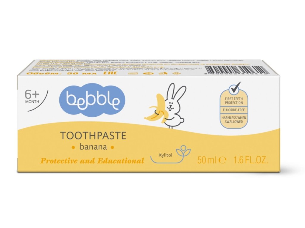Dětská zubní pasta banán Bebble, 50 ml. První malý zoubek děťátka by měl znamenat začátek správné rutiny ústní hygieny. Během prvních měsíců prořezávání zoubků je vhodné čistit dásně a rostoucí zuby pomocí gelu a jemné gázy. Když se vaše dítě stabilně postaví na nohy, obvykle mezi 8. a 12. měsícem, je čas ukázat mu, jak si čistit zuby zubním kartáčkem. Nízkoabrazivní složení, zabraňující tvorbě zubního kazu, vám nabízí dětská zubní pasta Bebble, která je tou správnou volnou pro jemné a šetrné čištění prvních zoubků. Přírodní xylitol zabraňuje množení mikroorganismů a pomáhá posilovat zubní sklovinu. Snižuje množení bakterií, čímž chrání před zanícenými dásněmi a zubním kazem. Pomáhá snižovat tvorbu povlaků a zvyšuje remineralizaci zubní skloviny. Kromě antibakteriálních vlastností je xylitol znám také svojí sladkou chutí. Dětská zubní pasta Bebble neobsahuje fluorid, konzervační látky ani barviva, díky čemuž je při spolknutí neškodná. Kromě toho, že děti milují jemnou jahovodou příchuť, pasta se může používat již od útlého věku. Použití: Na kartáček na mléčné zuby nebo prsty naneste množství pasty ve velikosti hrášku. Jemně vyčistěte zuby, dásně a jazyk. Opláchněte vodou. Vždy používejte speciální zubní kartáček, který odpovídá věku vašeho dítěte. Hledejte kartáčky s malou hlavou a tenkými štětinami a ergonomické rukojeti vhodné pro malé ruce. Dětský zubní kartáček, stejně jako u dospělých, by měl být vyměňován nejméně čtyřikrát ročně, nebo podle doporučení výrobce. Modelováním pravidelné rutiny ústní hygieny vždy dávejte svému dítěti příklad. S dovršením 3. roku by mělo vaše dítě postupně rozvíjet kontrolu nad polykacím reflexem. Tímto krokem začíná správné čištění zubů se stane přirozeným. Jakmile začnou dítěti přibývat trvalé zuby, zhruba od 5 do 6 let, můžete jim zavést zubní pastu s aktivními složkami. Do té doby pozorně sledujte, jak si vaše dítě myje zuby, v případě potřeby mu pomozte a používejte pasty s přírodními protizánětlivými přísadami. Složení: Glycerin, voda, hydratovaný oxid křemičitý, xylitol, xantanový kouř, oxid titaničitý, lauroylsarkozinát sodný, aroma, edta disodná, chlorid sodný. Upozornění: Tento výrobek neobsahuje mátu ani fluorid, díky čemuž je vhodný pro použití v kombinaci s homeopatickými léky.Doplňkové parametry