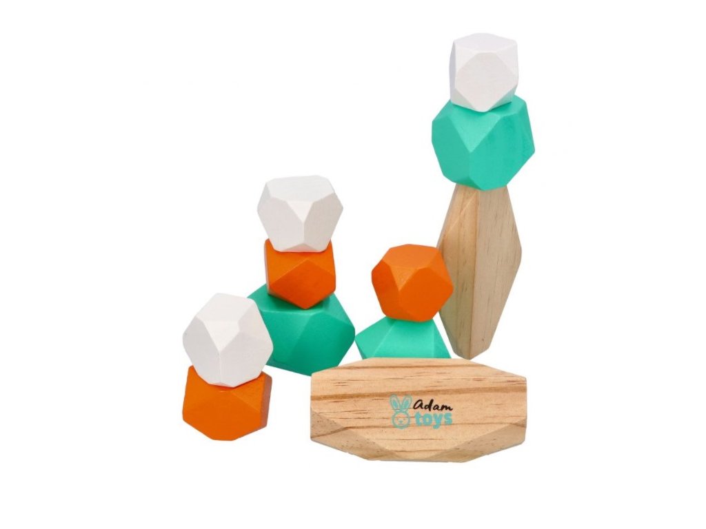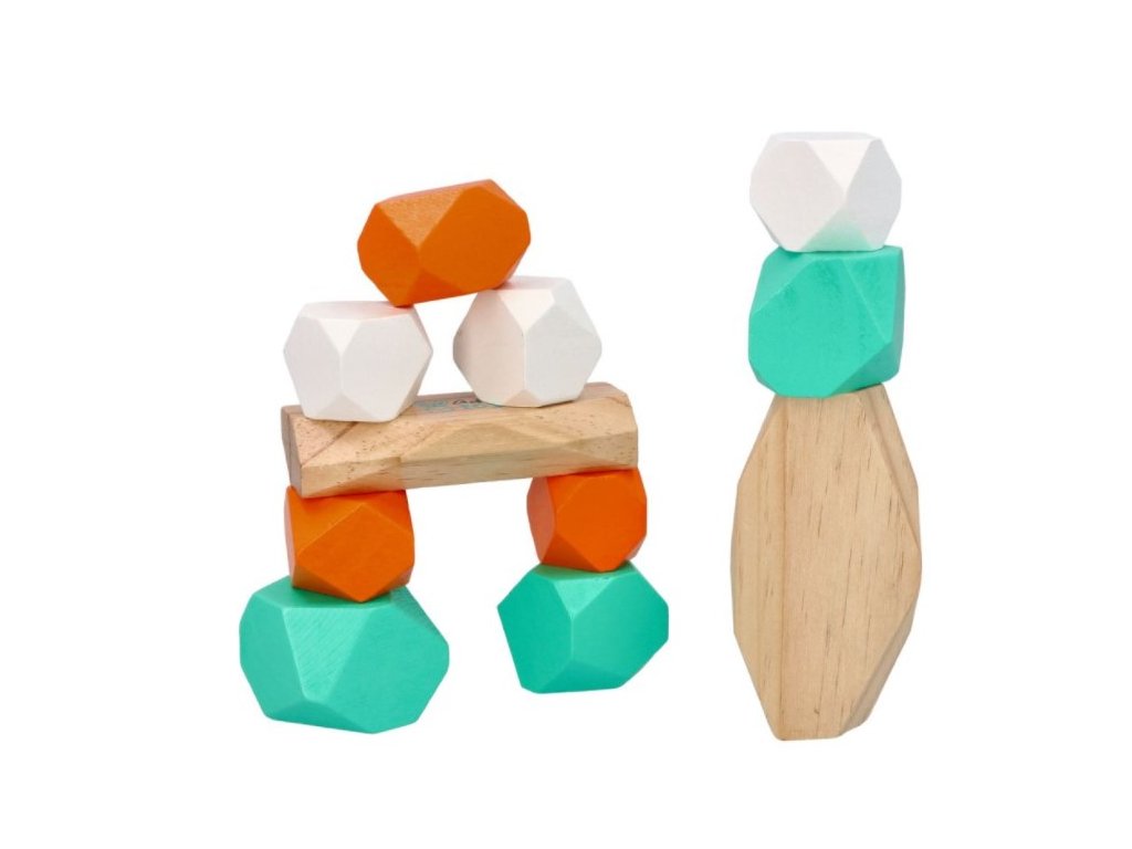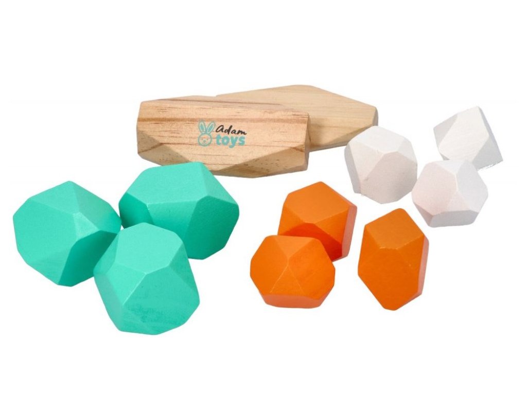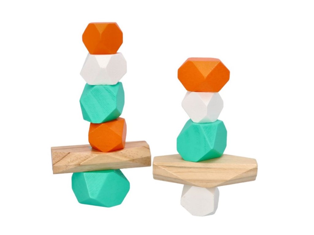 Balanční hra kameny. Tuto balanční hračku může hrát jedna osoba, stejně jako hru pro více lidí. Pravděpodobně jste již postavili věž z kvádrů, válců a dalších tvarů. Ale postavili jste věž z oblázků, které se vyznačují nepravidelnými a asymetrickými tvary? Vyzkoušejte to sami a uvidíte, jaká je zábava a radost stavět takovou věž :) Hra je skvělým dovednostním cvičením pro malíčky. Základem je stabilní kus dřeva, jeho tvar je sice také nepravidelný, ale při položení na příslušnou stranu stojí. Součástí sady je i druhá identická deska, kterou lze použít jako stabilnější základnu nebo, pokud si trochu zacvičíte, lze použít jako prvek věže. Vše záleží na vaší fantazii a šikovnosti. S tímto řešením, kromě umístění oblázků na pravou stranu, budete muset také udržet rovnováhu správným rozložením těžiště. Sada balančních oblázků se skládá celkem z 11 prvků: 2 obdélníkové kusy dřeva (12 x 6 x 2,5 cm) 1 velký mátový kámen (4,5 x 5 x 5,5 cm) 2 střední mátové kameny (4,5 x 4,5 x 4,5 cm) 2 středně oranžové kameny (3,5 x 4 x 4,5 cm) 2 středně bílé kameny (4 x 4 x 3,5 cm) 2 malé bílé a oranžové kamínky (3,5 x 3,5 x 3,5 cm) Rozměry balení: 26,5 x 15 x 6 cm . Věk: 18m +Doplňkové parametry