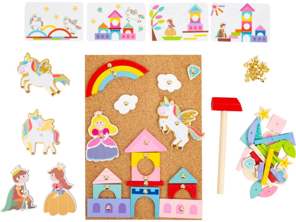 Small foot Zatloukací hra Jednorožec. Magická zábava s kladivem a připínáčky. V balení najdete korkovou desku, kladivo, připínáčky a dřevěné objekty různých tvarů. Děti si mohou na desce/nástěnce díky zatlkoukačce vytvořit různé obrázky. Ať je to princezna, pohádkový hrad nebo jednorožec, obsauje tato sada vše k vytvoření kouzelného obrazu. V balení najdete také obrázkové předlohy, z kterých se děti mohou inspirovat. Rozměry:Rozměry tabulky: 24x17x1 cm Rozměry kladivka: 14x4 cm Věk: +3.Doplňkové parametry