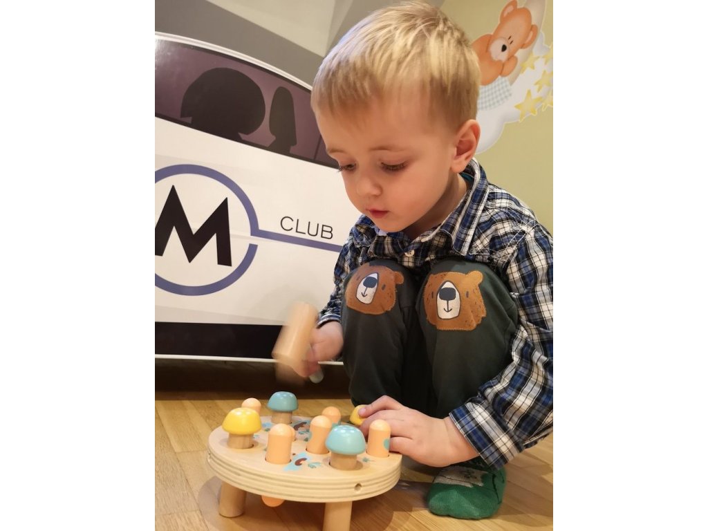Dítě při hře zatlouká dřevěné kolíčky v podobě mrkvičky do otvorů v desce.