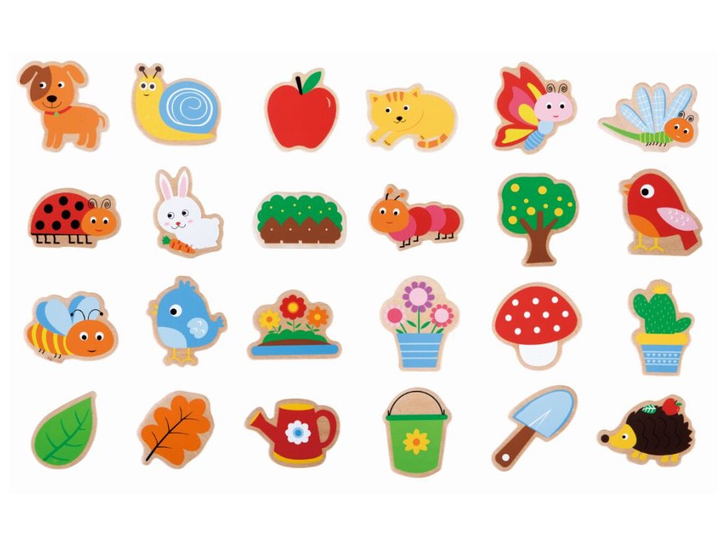 Tato sada obsahuje 24 dřevěných magnetků znázorňujících zahrádku.
