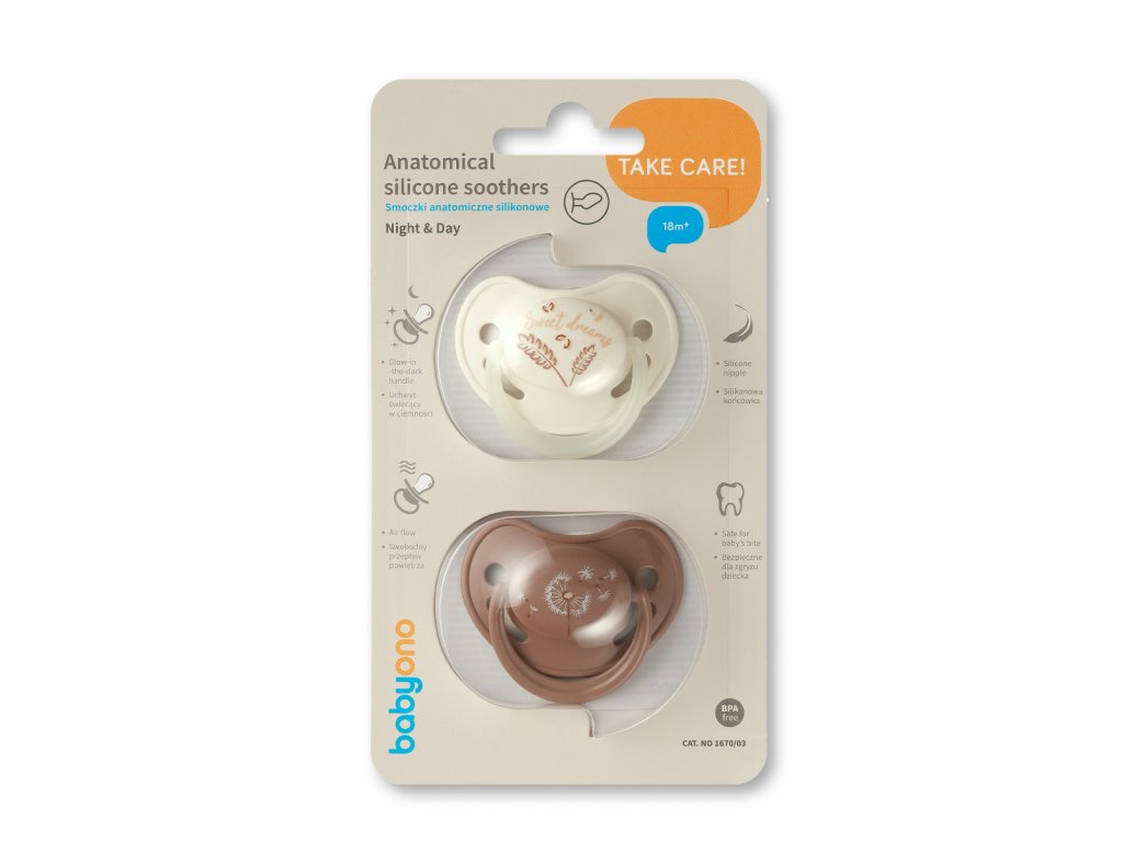 Silikonový anatomický dudlík 18m+ – sada 2 ks, denní a noční se svítící rukojetí. Silikonový anatomický dudlík pomůže vašemu miminku zklidnit se a vám poskytne tolik potřebnou úlevu. Díky speciálnímu tvaru – vypouklý nahoře a zploštělý dole – se dokonale přizpůsobí dětským ústům, podporuje správný vývoj patra i skusu a je bezpečný pro zoubky i dásně. Tvarovaný štít s ventilačními otvory umožňuje volné proudění vzduchu a chrání citlivou pokožku kolem úst před podrážděním. Savička je vyrobena ze 100% hypoalergenního silikonu, který je odolný, hygienický a BPA free. V balení najdete 2 dudlíky – jeden určený pro denní použití a druhý se svítící rukojetí, který snadno najdete i v noci v postýlce či pod peřinkou. Díky praktickému očku lze dudlík připevnit na klip a mít jej vždy po ruce i na cestách. Anatomický tvar savičky napodobuje přirozený tvar maminčina prsu, podporuje správnou polohu jazyka, zdravý sací reflex a je doporučován logopedy. Díky snadné sterilizaci vyvařením zajistíte dokonalou hygienu a bezpečí pro vaše dítě. Výhody silikonového anatomického dudlíku 18m+. Symetrická savička pro správný vývoj patra a skusu. Denní i noční dudlík se svítící rukojetí pro snadné hledání ve tmě. Ventilační otvory zajišťující volný průchod vzduchu a ochranu jemné pokožky. Měkký silikon s tenkým krčkem šetrný k dásním a zoubkům. Praktické očko pro uchycení klipu. Bezpečný a odolný materiál bez BPA, PVC a ftalátů. Doporučení logopeda. Anatomické silikonové dudlíky 18m+ podporují správný vývoj řečového aparátu. Díky konturovanému tvaru a větracím otvorům umožňují volné dýchání nosem, zdravé polykání i správnou polohu jazyka při sání. Zajišťují tak pohodlí dítěte a zdravý vývoj dutiny ústní. Bezpečnostní pokyny. Před prvním i každým dalším použitím dudlík důkladně umyjte a sterilizujte vyvařením po dobu 5 minut. Nepoužívejte agresivní chemikálie ani nenechávejte dudlík v roztoku déle, než je doporučeno. Nikdy nepřivazujte k dudlíku necertifikované šňůrky či stužky – hrozí nebezpečí udušení. Používejte pouze schválené držáky dudlíků dle normy EN 12586. Před každým použitím zkontrolujte stav dudlíku, zejména pokud má dítě zoubky. Poškozený, prokousnutý nebo zdeformovaný dudlík ihned vyhoďte. Z hygienických a bezpečnostních důvodů se doporučuje výměna dudlíku každých 1–2 měsíce. Dudlík vždy používejte pod dohledem dospělé osoby a nikdy jej nenamáčejte do sladkostí či léků – hrozí vznik zubního kazu. Pokud se dudlík dostane celý do úst dítěte, zachovejte klid – není možné jej spolknout a otvory ve štítu umožňují volné dýchání. Jemně jej vyjměte. Uchovávejte na suchém místě při pokojové teplotě, mimo přímé slunce a zdroje tepla. Technické parametry. Typ: anatomický dudlík. Materiál: silikon. Věk: 18 m+. Balení: 2 ks. Certifikace a shoda. Výrobek splňuje evropskou normu EN 1400. Doporučené držáky dle EN 12586. Produkt je zdravotně nezávadný, BPA free, CE certifikovaný a plně bezpečný pro dětské použití v rámci EU.Doplňkové parametry
