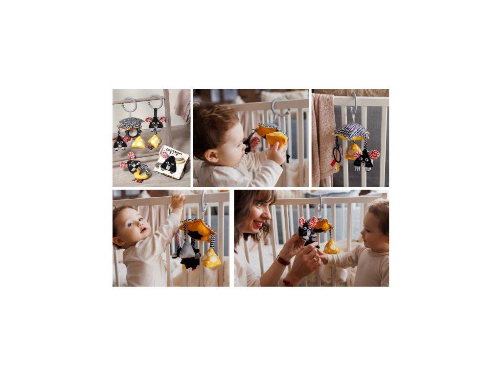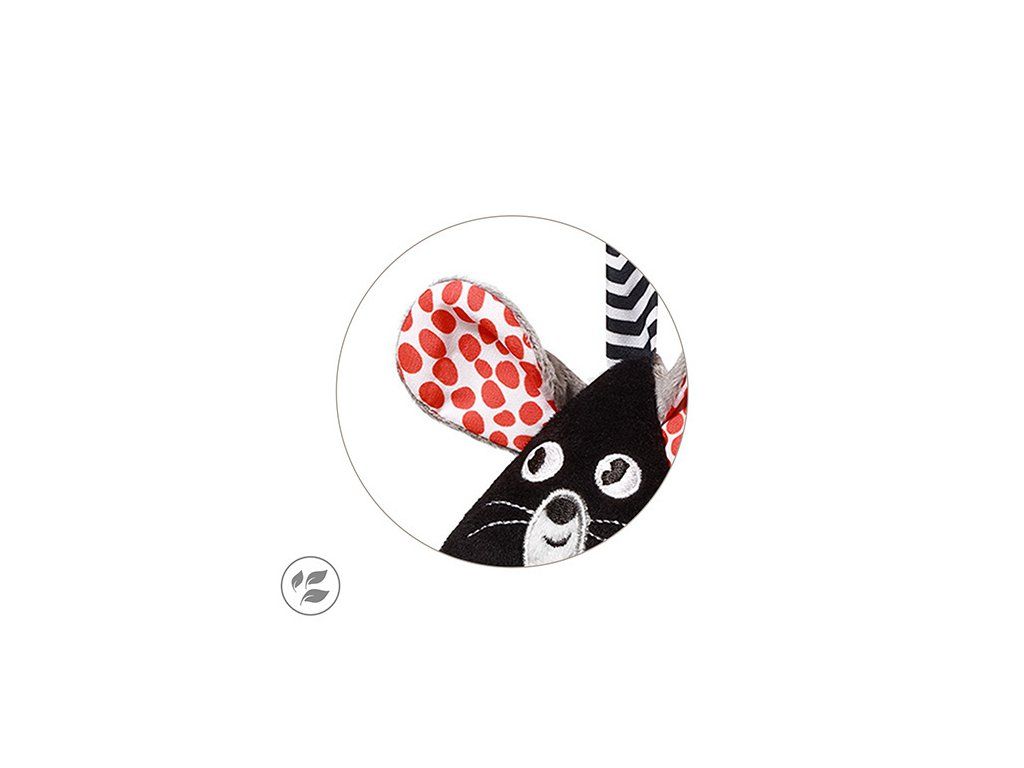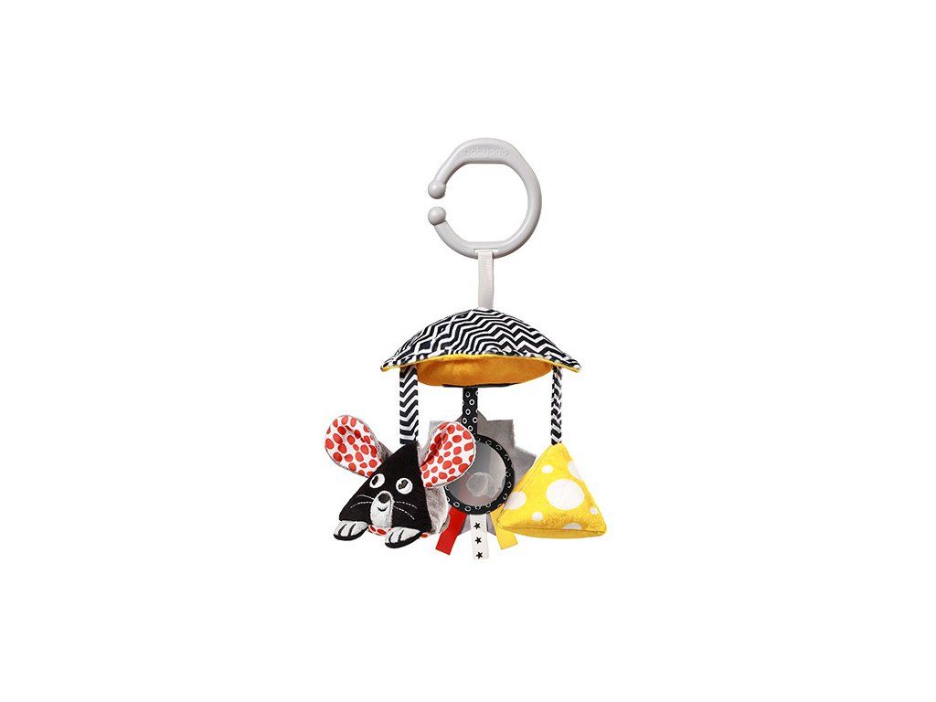 Kontrastní kolotoč MOUSE – senzorická závěsná hračka pro miminka Kontrastní kolotoč MOUSE je hravá senzorická závěsná hračka plná překvapení, která podporuje přirozený vývoj miminka již od narození. Veselá myška probouzí dětskou fantazii, stimuluje smysly a podporuje rozvoj jemné motoriky. Kolotoč je vybaven dvěma chrastítky a šusticími prvky, které rozvíjejí sluch, barevnými štítky a zatočeným ocáskem, jež motivují k uchopování, a také bezpečným zrcátkem pro objevování vlastního odrazu. Hračka je navržena v kontrastních barvách s geometrickými vzory, které podporují vývoj zraku už od prvních měsíců života. Závěsku snadno připevníte na kočárek nebo autosedačku a zajistíte tak zábavnou a rozvojovou hru doma, na procházkách i na cestách. Chrastítka v myšce a sýru Kolotoč obsahuje dvě chrastítka s odlišnou intenzitou zvuku. Jedno vydává jemnější tón, druhé výraznější. Podporují sluchové vnímání a motivují dítě k pohybu, třepání a objevování. Šusticí ouška Dotykem oušek vzniká jemný šustivý zvuk, který podporuje zvídavost a rozvoj smyslového vnímání prostřednictvím dotyku a mačkání. Praktické zavěšení Díky univerzálnímu úchytu lze hračku snadno zavěsit na kočárek, postýlku nebo autosedačku. Závěsku jednoduše připnete i sundáte podle potřeby. Barevné štítky a hravé detaily Vystupující stužky v kontrastních barvách a geometrických vzorech upoutají pozornost a vybízejí k dotyku. Dítě si při hře přirozeně procvičuje úchop a obratnost prstíků. Zrcátko Zrcátko je vyrobeno z bezpečného materiálu. Pozorování vlastního odrazu podporuje rozvoj sebeuvědomění a koordinaci ruka–oko. Podpora zdravého vývoje Kolotoč je navržen tak, aby se dobře držel v malých ručičkách. Podporuje rozvoj jemné motoriky, koordinace ruka–oko, smyslového vnímání a dětské fantazie. Technické informace Materiál: polyester. Rozměr: cca 27 × 16 cm. Obsahuje: dvě chrastítka, šusticí ouška, zatočený ocásek, barevné štítky, bezpečné zrcátko a praktický úchyt k zavěšení. Vhodné pro děti Od narození (0 m+). Bezpečnostní upozornění Hračku připevňujte mimo dosah dítěte. Při pokusech dítěte o lezení nebo zvedání se hračku odstraňte. Odstraňte veškeré obalové a upevňovací prvky, které mohou být nebezpečné. Před každým použitím zkontrolujte stav výrobku. Používejte pouze nepoškozenou hračku. Při prvních známkách poškození výrobek přestaňte používat. Používejte vždy pod dohledem dospělé osoby. Výrobek splňuje normu EN 71. Obal uchovejte pro případné informace a skladujte mimo dosah dětí.Doplňkové parametry
