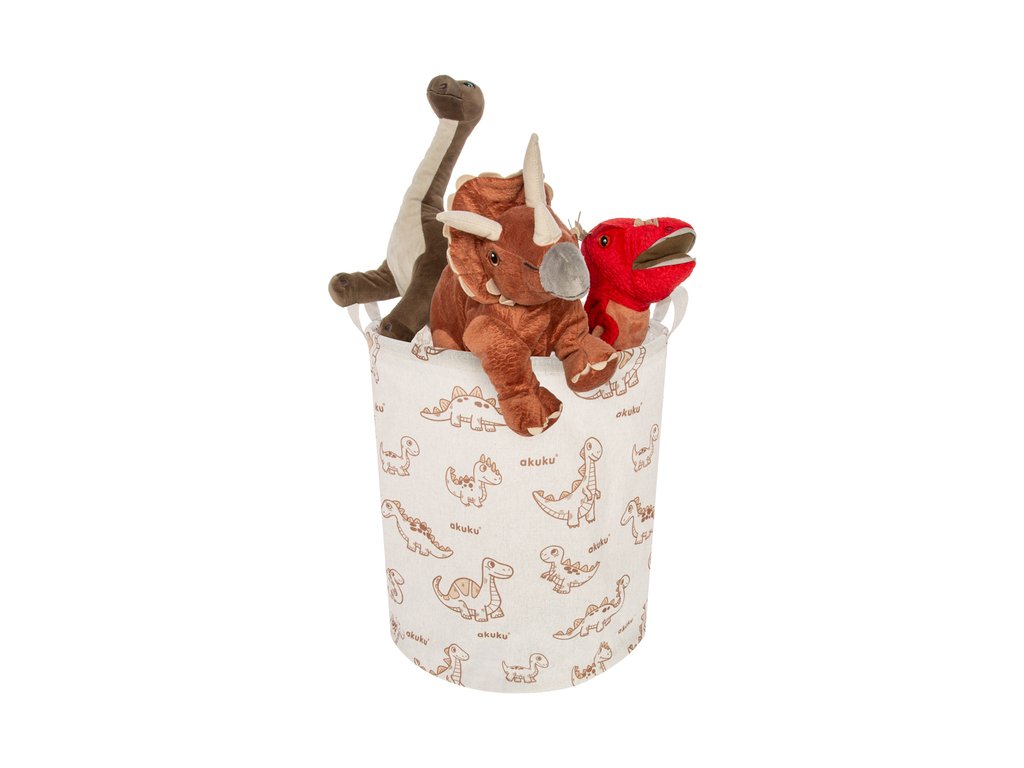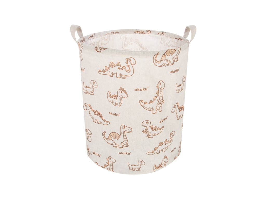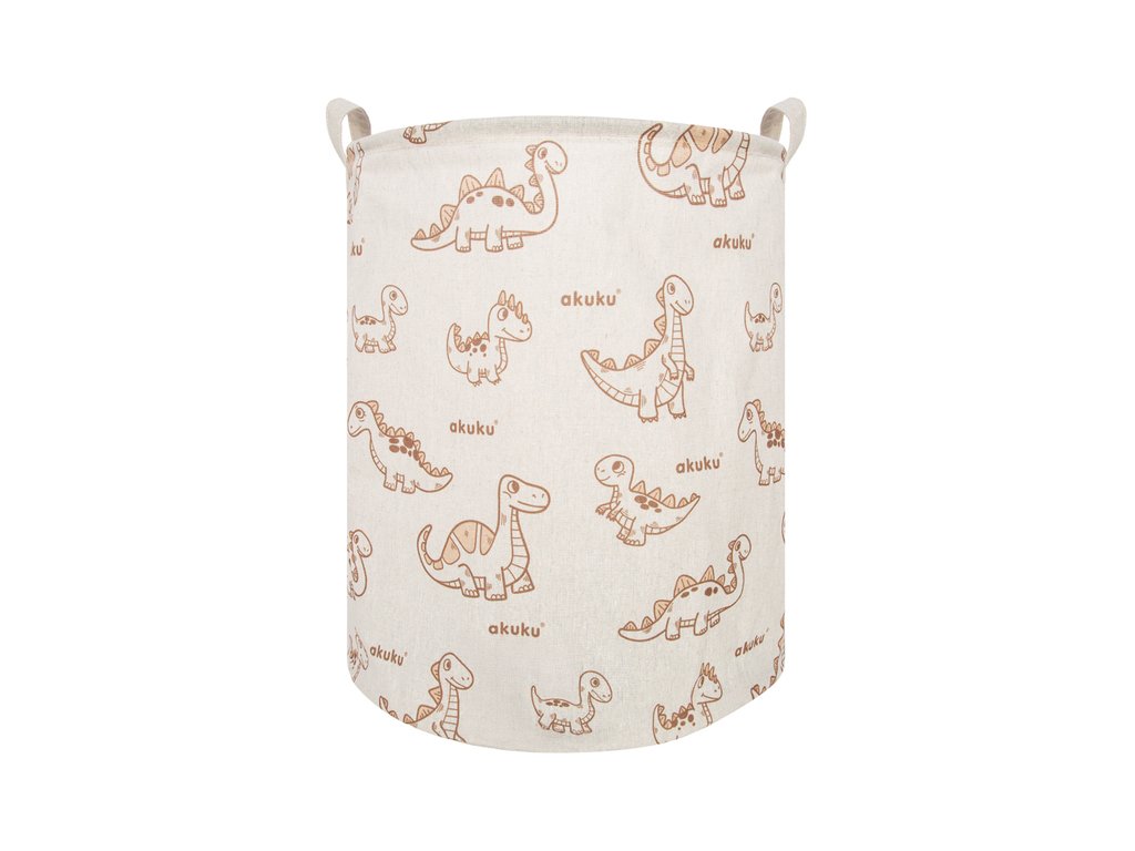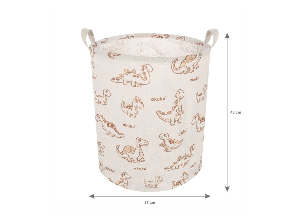 Koš na hračky a další předměty je praktický pomocník do každé domácnosti. Skvěle se hodí do dětského pokoje, ložnice nebo koupelny. Ideální pro ukládání hraček, plyšáků, knížek, prádla i drobností. Elegantní černo-bílý design zapadne do každého interiéru. Vnitřní voděodolná vrstva chrání koš před vlhkostí a nečistotami. Dvě pevná ucha umožňují snadné přenášení a manipulaci. Hlavní výhody: Funkční řešení pro organizaci v různých místnostech. Voděodolný interiér zabraňuje prosáknutí vlhkosti na podlahu. Vede děti k pořádku a samostatnosti. Lehký a skladný – lze jednoduše složit a uložit. Vhodný i k zavěšení díky praktickým úchytům. Technické údaje: Design: akuku dino. Materiál zvenku: bavlněná tkanina. Materiál uvnitř: voděodolný PE. Průměr: 37 cm. Výška: 43 cm. Hmotnost: cc 220 g. Objem: cca 45 litrů. Upozornění: Před každým použitím zkontrolujte stav výrobku. Při prvních známkách opotřebení nebo poškození koš dále nepoužívejte. Výrobek není hračka. Neponechávejte dítě bez dozoru. Obal výrobku uchovávejte mimo dosah dětí. Upozornění dle nařízení EU a ČR: Tento produkt splňuje požadavky na bezpečnost spotřebního zboží dle platné legislativy EU a ČR. Používejte v souladu s účelem použití. Před použitím si přečtěte návod a bezpečnostní informace, které si uschovejte pro případné budoucí použití.Doplňkové parametry