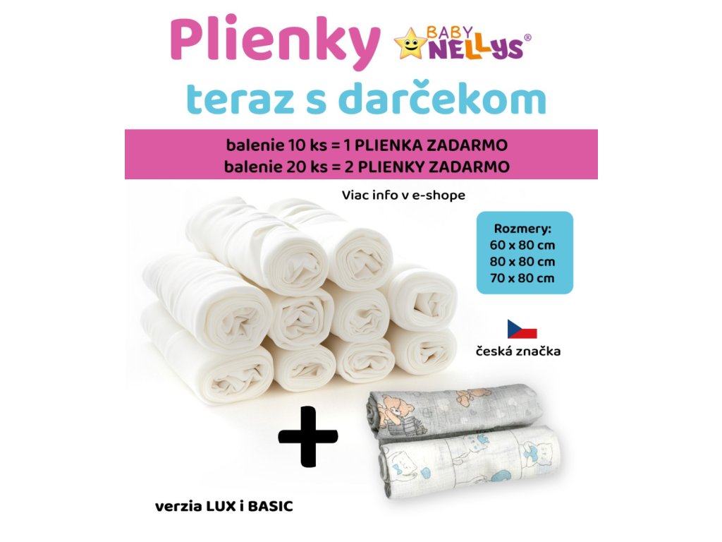 Bavlněné tetra plenky BASIC 80×80cm Baby Nellys® – česká značka, záruka kvality a spokojenosti. DÁREK: k balení nyní získáte 1 ks pleny 70×80 cm ZDARMA. Mix barev nebo vzorů – nelze vybírat. Zdarma může být i bílá plena podle dodání výrobcem. Oblíbený produkt. Proč si vybrat tetra plenky BASIC? DOPORUČUJEME – TESTOVÁNO MAMINKAMI. Před zařazením do prodeje byly plenky skutečně testovány maminkami. Po vyprání jsou měkké, pevné a neztrácejí tvar. Skvělá volba pro každodenní použití doma i na cestách. Vlastnosti a balení Balení obsahuje: 10 ks plen + 1 ks pleny ZDARMA (mix barev/vzorů; nelze vybírat). Materiál / složení: 100 % bavlna. Gramáž: 110 g/m2. V nabídce máme také i variantu LUX s vyšší gramáží až 140 g/m2. Využití Univerzální látkové pleny 80×80 pro přebalování, jako osuška, podklad do postýlky či kočárku, při kojení i jako jemná utěrka. Údržba – jak prát a co nedělat Doporučené praní: do 60 °C. Před prvním použitím vyperte samostatně. Sušení: ideálně volně; sušička možná na nízký stupeň. Žehlení: do cca 150 °C (střední stupeň). Nedoporučujeme: aviváž (snižuje savost), chlórové bělení, chemické čištění, dlouhodobé sušení na přímém žáru (radiátor). Tip: nepřeplňujte pračku – savé tkaniny potřebují dostatek vody pro důkladné vymáchání. Běžná tolerance srážlivosti a rozměrů U výrobků ze 100 % bavlny je běžná srážlivost po prvních praních přibližně 5–10 % – nejde o vadu, ale přirozenou vlastnost materiálu. U šitých textilních výrobků se může vyskytnout drobná výrobní odchylka rozměrů (orientačně ± 3 %). Zákonné a bezpečnostní informace Označení složení: 100 % bavlna. Bezpečnost materiálu: výrobek je určen pro vícenásobné použití, ke kontaktu s dětskou pokožkou; splňuje požadavky obecně závazné legislativy EU. Upozornění: Před prvním použitím vyperte. Výrobek není hračka. Uchovávejte mimo dosah otevřeného ohně. Péče o výrobek: Dodržujte uvedené pokyny pro praní a údržbu, aby byla zachována savost a životnost.Doplňkové parametry