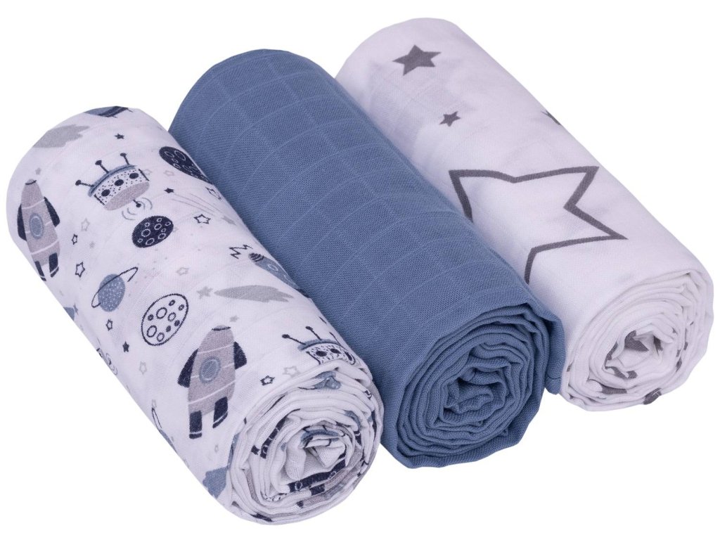Mušelínové pleny 3ks Lux - Kosmo, 70 x 80 cm, modrá, bílá