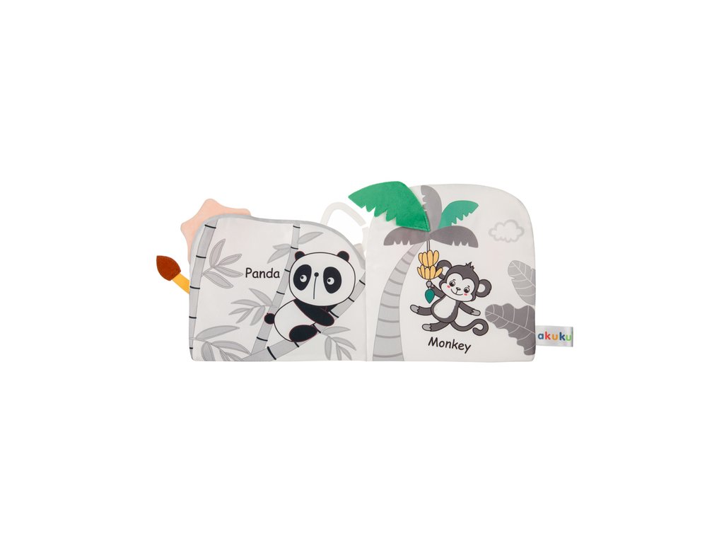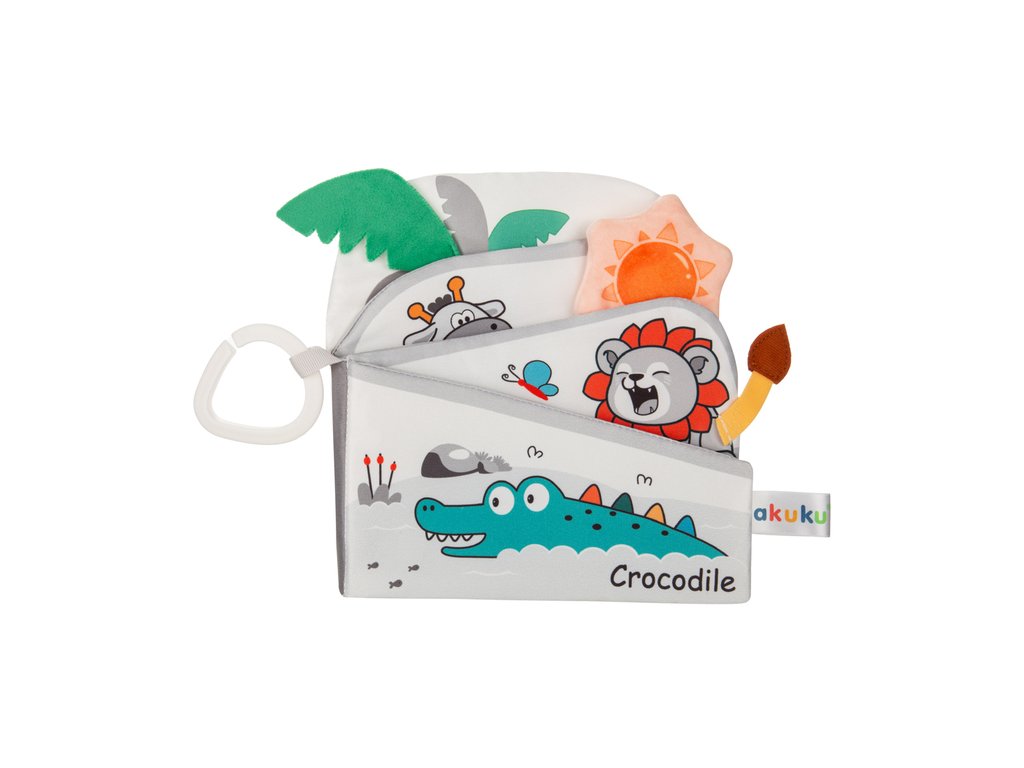 Senzorická knížka Zoo pro miminka. Hravé poznávání zvířátek, barev a tvarů. Tato interaktivní senzorická knížka nadchne každé miminko. Zapojí zrak, hmat i sluch a přirozeně podporuje rozvoj dětských dovedností. Veselé ilustrace a různorodé struktury probouzejí zvědavost. Příjemné postavičky zvířátek lákají objevovat svět safari i džungle. Knížku lze snadno vzít s sebou a používat každý den doma i na cestách. Hlavní přednosti. Bezpečná a měkká konstrukce. Vyrobena z příjemných materiálů vhodných pro jemnou dětskou pokožku. Barevné ilustrace pro rozvoj zraku. Zvířátka jako hroch, lev, krokodýl a motýl přitahují pozornost a motivují ke hře. Senzorické prvky na každé stránce. Různé textury a měkké detaily vybízejí k dotyku a procvičují jemnou motoriku. Praktické zavěšení. Díky úchytu ve tvaru srdce lze knížku snadno připnout na kočárek, postýlku nebo hrazdičku. Učení hrou. Dítě poznává zvířata, tvary a barvy a rozvíjí koordinaci ruka oko. Skvělý tip na dárek. Knížka přináší radost, podporuje smysly a je ideální pro každodenní zábavu. Specifikace. Rozměry 18 × 18 cm. Materiál polyester. S touto knížkou může vaše miminko objevovat nové podněty, trénovat smysly a bavit se celé hodiny. Skvěle se hodí do výbavičky i jako milá pozornost pro nejmenší. Bezpečnostní upozornění. Používejte pouze pod dohledem dospělé osoby. Před předáním dítěti odstraňte veškeré obaly. Před každým použitím výrobek pečlivě zkontrolujte. Při prvních známkách poškození nebo opotřebení výrobek vyřaďte z používání. Pokyny k čištění. Udržujte výrobek v čistotě. Perte v ruce a sušte volně na vzduchu. Čistěte pouze povrchově. Složení 100 % polyester.Doplňkové parametry