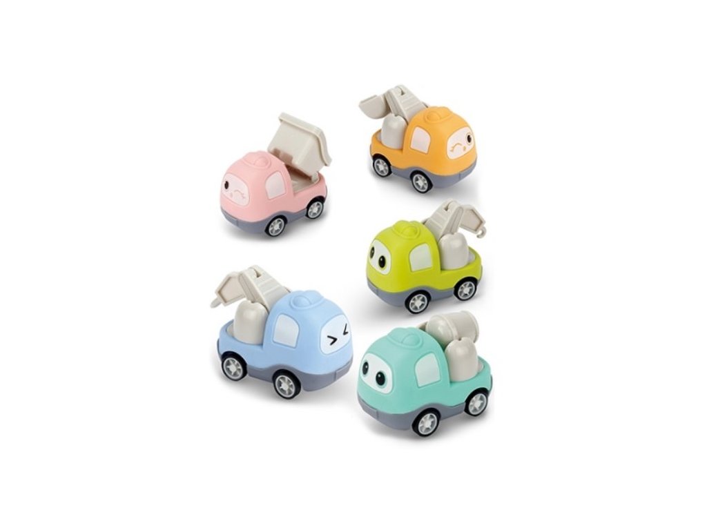 Stavební mini autíčko. Veselé stavební auto v pastelových barvách a s veselými tvářemi dodají zábavě větší rozměr radosti. Rozměry autíčka: 5 x 4 cm. Věk: 3 +.Doplňkové parametry