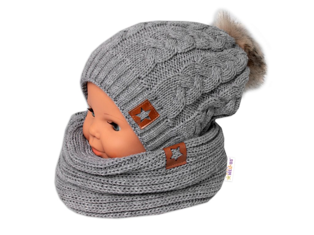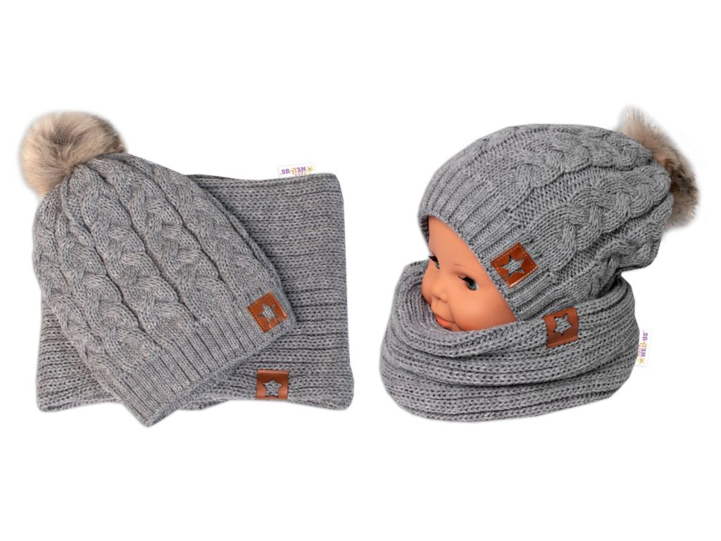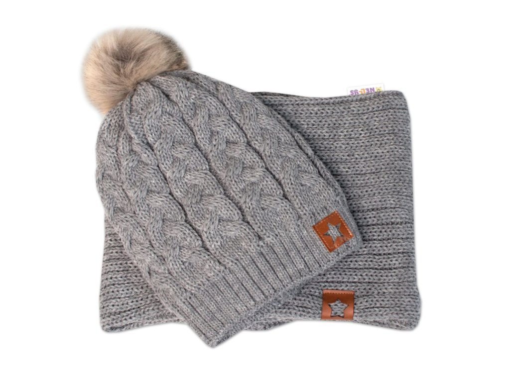 Zimní dvouvrstvá čepice s bambulí + komínek Star, šedá